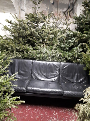 Ein angenehmer Kontrapunkt findet sich im Keller. Dort steht, inmitten von Weihnachtsbäumen, ein schwarzes Ledersofa. Ich atme eine Brise Wald ein und streife gedankenverloren entlang eines Tannenastes, froh über die Möglichkeit etwas in die Hand zu nehmen. Für einen Moment bin ich ganz woanders. Dann kehrt meine Aufmerksamkeit zu den erstaunlich grünen Tannen zurück, und ich frage mich, warum sie weder fahl werden noch nadeln. Direkt darüber befindet sich ein Raum, den ich nicht entdeckt hätte, wenn nicht vor mir eine Aufsicht hinein geschaut hätte. Das Zimmer wird von einer schwarz angesprayten Holzinstallation dominiert, die an ein erweitertes Hochbett inklusive Laptop, Bücherregal und Sitzgelegenheiten erinnert. Eine biografische Lesart drängt sich auf, wahrscheinlich ist die Künstlerin in einem ebensolchen Möbel groß geworden (und hat sich damals schon die Balken entlang gehangelt?). Neben der Tür hängt eine Axt, die mit ihrem Gewicht das Öffnen der erschwert. In meiner Phantasie spiele ich diverse Szenarios durch, was man mit dieser Axt alles anfangen könnte und wundere mich, dass noch niemand auf die Idee gekommen ist, mit ihr auf die Installation einzudreschen.