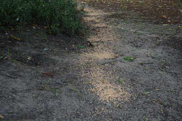 In ihrer losen Gruppe von Fotografien mit dem Titel „Architectures of Care“ zeigt Anne Linke verstreutes Futter – eine Geste, die in der kurzen Zeitspanne zwischen Verteilung und Verzehr sichtbar wird. In vielen Städten ist das Füttern von nichtmenschlichen Tieren im öffentlichen Raum verboten. Diese menschliche Gewohnheit, die sich nicht durch Gesetze stoppen lässt, gilt als hartnäckig. Das Verstreuen erscheint beiläufig, die Handlung selbst ist gezielt und schnell ausgeführt. Es wird in Streifen oder Linien gestreut, manchmal flächig, in Kreisen oder punktuell. Als Hinweise auf den gemeinsam genutzten (Stadt)raum passen sich die Fotografien unterschiedlichen Ausstellungskontexten an und reagieren in ihrer Größe auf den Raum, an dem sie gezeigt werden.