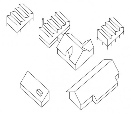 Neben den zwei Ateliers auf Stelzen, baute Aicher den alten Rotisser Sägeschuppen in eine geräumige Halle um – die auch mit Sheddächern bedeckt ist. Er errichtete eine Garage mit Pultdach und baute die zwei alten Satteldachgebäude aus, das Mühlenhaus und den Kuhstall.