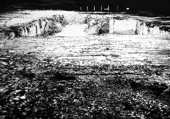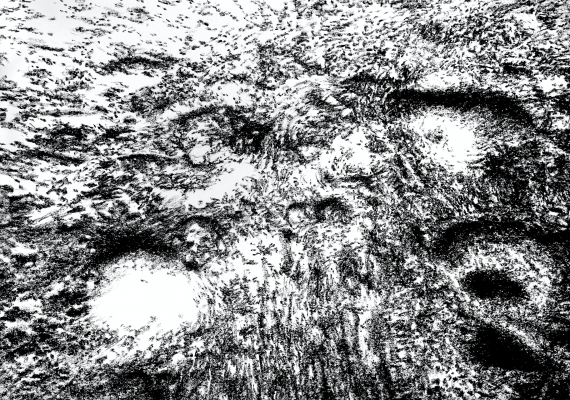 Andere Bilder fallen, trotz des fast fotorealistischen Eindrucks, den sie aus einer gewissen Entfernung wecken, aus der Nähe völlig in einzelne Striche, in Zusammenballungen oder Streuung der Kohlepigmente auseinander. Sie lösen sich zu einem schwarz-weißen Rauschen auf. Vor unserem inneren Auge jedoch ziehen wir dieses abgestuften, mal sich entziehenden, mal dichter werdenden Kohlegestöber zu projizierten Bildeinheiten zusammen, so wie wir Formen in Wolken hinein sehen.