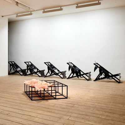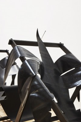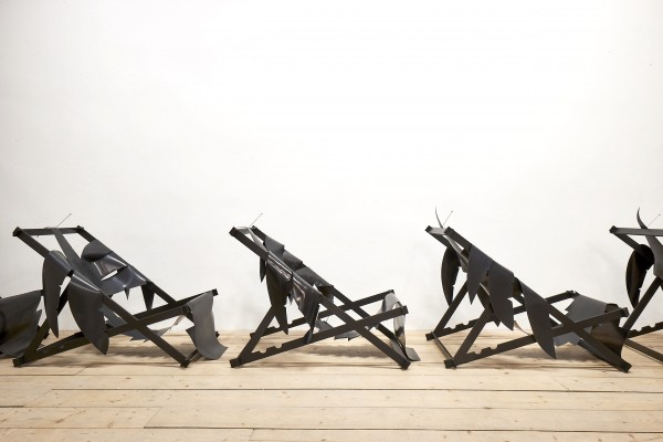 Die Silhouette eine Palme aus schwarzem Gummi liegt auf dem postapokalyptisch anmutenden Skelett eines Liegestuhls. Die Palme gibt sich ganz und gar der Schwerkraft hin, sie würde sofort zu Boden fließen, wäre da nicht ein Cocktail-Spieß, der dafür sorgt, dass sie am Rahmen des Liegestuhls hängen bleibt. So aber wird die Palme an ihrem Platz gehalten, auf dem sie so tut, als könnte sie ihre Funktion als Liegefläche eines Liegestuhls noch erfüllen. Dabei ist es ganz offensichtlich, dass diese Liegefläche bei der geringsten Belastung nachgeben und zu Boden sinken würde. Franziska Opel beschäftigt sich in ihrer Installation „Lazy days“ mit der Ambivalenz des Skulpturalen und materialisiert dabei ein paradoxes, fast perverses Verhältnis zu dem, was wir „Freizeit“ nennen.