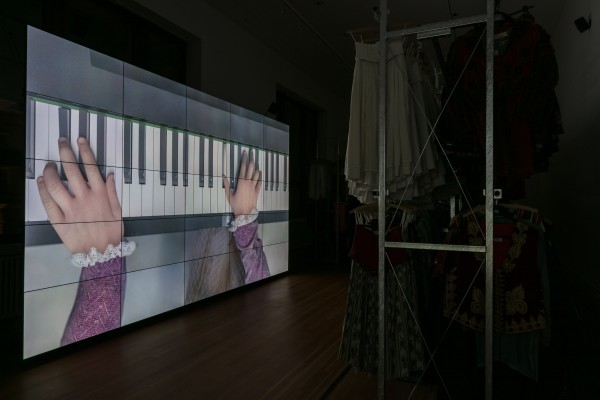 Plötzlich überlagern sich die Sounds zu Klaviermusik und auch die Bilder auf den großen Screens synchronisieren sich. In den Fokus rücken die Klaviere, auf denen Hände spielen. Die Atmosphäre im Raum verändert sich, aus dem versunkenen Schauen/Hören wird ein etwas aufgeregtes Gucken, weil man nichts verpassen will und wir versuchen einen Standpunkt einzunehmen, von dem aus man mehrere Screens im Blick hat. Statt um kurze Loops handelt es sich also um eine Gesamtkomposition ähnlich wie bei der Filminstallation Manifesto von Julian Rosefeldt – das finde ich stark, weil die Filmarbeiten dadurch noch mal einen anderen Dreh bekommen.