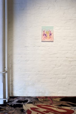 Miranda Keyes’ hier gezeigte Glasobjekte Loamy Burrs setzen sich aus verschieden bearbeiteten transparenten und matten Oberflächen zusammen. Ein bauchiges Zentrum und jeweils zwei sich in verschiedene Richtungen windende, hauchdünn auslaufende Spitzen umschließen eine braun schimmernde Flüssigkeit, die an den Enden der Objekte wie aus einer Glaspipette heraustreten wollen, aber durch die geschlossene Form nicht können. Viele Assoziationen und poetische Bilder, die sich um die Formen spinnen und die die Künstlerin in ihren Texten zu den einzelnen Arbeiten beschreibt. In Loamy Burrs spricht sie von “kuppelgemolkenem Saft” und spielt auf die fast nur im Schatten ihrer selbst sichtbaren, hauchzarten Zitzen oder Kuppeln der Glasobjekte an, die in Verbindung mit Raphaela Vogels Melkmaschine zurück zu der Thematik des Ernährens und Voneinander-Zehrens führen. Auch erinnern sie an feuchte, lehmige Fahnen- und Algengewächse oder an auf der Wand ausharrende Insekten, deren Formen sich in den Hörnern und Krallen der Dämonen auf dem Teppich wiederfinden.