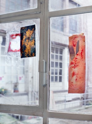 Sinkhole Project ist eine kuratorische Plattform, die 2016 von Joe Speier in Baltimore, Maryland gegründet wurde. Die Ausstellungen finden zumeist kurzweilig im öffentlichen Raum, an Zäunen und Mauern statt. Im Rahmen von Parasites wurde Sinkhole Project eingeladen, ein Konzept innerhalb der Ausstellung (eine Ausstellung in der Ausstellung) umzusetzen und bespielt die weitläufige Fensterfront der Ausstellungshalle. Joe Speier wiederum lud die Galerie Gern en Regalia, die in New York (Manhattan, Lower East Side) beheimatet ist, ein, innerhalb seines Konzeptes, Produkte auszustellen, die ihr Galerieprogramm bewerben (T-Shirts, Sticker-Editionen, Logos). Zudem zeigen Zoe Brezsny und Mario Miron, die Gern en Regalia betreiben und mit Joe Speier befreundet sind, ihre eigenen Zeichnungen und Malereien. Das gesamte Konzept thematisiert die parasitäre Beziehung zwischen Künstler*innen und den von ihnen betriebenen Artist Run Spaces und Galerien. Die Einbeziehung eines weiteren Kunstortes wie Gern en Regalia impliziert das Netzwerk dieser Räume und ihrer Leiter*innen, Freundschaften und gegenseitig vorteilhaften Transaktionsbeziehungen, die sich um das Interesse der Verbreitung von Kunst bilden. “Mich reizt die Idee, Gern als eigenständiges Kunstwerk neben den Zeichnungen und Gemälden von Mario und Zoe (den Gern-Direktor*innen) zu rahmen.” sagt Joe Speier. “Ich war daran interessiert, die Shirts auszustellen, weil sie als Werbung für eine Galerie fungieren, die so klein ist, dass sie nie Verkäufe macht und nicht wirklich ein Geschäft betreibt. Das stellt die Natur der von Künstler*innen geführten Räume als Unternehmen und als Erweiterung ihrer kreativen Praxis in Frage.”