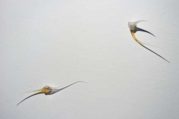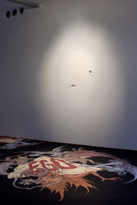 Die Objekte hängen und stehen dicht über der Teppicharbeit von Zuzanna Czebatul, greifen die Konstellation der dort abgebildeten Figurengruppe auf, indem sie wie ein Spiegelbild über ihr schweben.