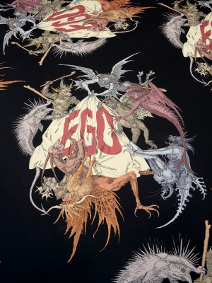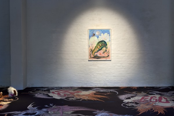 Die den gesamten Boden des Raumes bedeckende Arbeit Des Wahnsinns schöne Kinder der Künstlerin Zuzanna Czebatul zeigt eine Figurengruppe aus 9 dämonischen Wesen, die an einem Tuch mit der tiefroten Aufschrift EGO ziehen, zerren, mit Knüppeln auf es einschlagen. Die Szene bildet einen Rapport, der als Dessinierung die 300 Quadratmeter-große Bodenfläche überzieht. Das Bildelement lehnt sich kompositorisch und zeichnerisch an Martin Schongauers Kupferstich Der heilige Antonius, von Dämonen geplagt (ca 1470) an. Wie auch der, in der christlichen Darstellung zentral platzierte Mann, kann sich das Tuch nicht wehren oder schützen und wird gleichzeitig in ikonografischer Verklärtheit unversehrt abgebildet. Dieses Spannungsverhältnis zeigt die in politische Ideologien eingebetteten Strukturen und Ästhetiken der Macht auf, die Kern von Czebatuls Arbeit sind. Ein kollektives Ego nimmt Raum ein und wird gleichsam belagert, gepeinigt, beeinträchtigt, nicht zuletzt durch die Entwicklungen der gegenwärtigen gesellschaftlichen und pandemischen Krise. Auch die durch das Aufgreifen des Kupferstichs thematisierten christlich fundamentalen Wertesysteme bieten eine Analogie zu der aus den Ufern geratenen Welt und erschaffen eine weltumspannende Makroperspektive. Die rythmische Wiederholung, Anordnung und Drehung der Rosette um die eigene Achse erweitert die Ausstellungshalle nach außen, sprengt räumliche Begrenzungen und dehnt sie gedanklich aus. Die weiteren Arbeiten der Ausstellung werden von der raumgreifenden Bodenarbeit beeinflusst und belagern, besetzten gleichsam den Teppich.