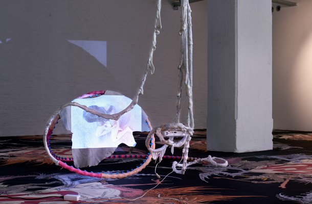 Der Blick der in Kinke Koois konkave Wölbungen eingesogen wird, führt auch in die Videoinstallation Uterusland von Raphaela Vogel hinein: das Video zeigt eine Frau, die ein künstliches Baby in den Armen hält und in einer traumartigen Szene ein klaustrophobisch enges, nicht enden wollendes Rohr durchgleitet. Es geht um das Gebären und Hervorbringen der eigenen Künstler*innen-Identität, einer emanzipierten künstlerischen Produktion, die für Raphaela Vogel immer auch mit einer schonungslosen Selbstrepräsentation einhergeht, die den Druck des Schaffensdrangs als Bedrängnis wie auch als Kraft zu erkennen gibt. Im Kontext der Ausstellung wird durch Uterusland auch die Frage nach Geschlechterkonstruktionen thematisiert: wer wird in welchen Körper, in welches biologische Geschlecht hineingeboren? Es entsteht die Vorstellung den eigenen Körper zu bewohnen, der Körper als Hülle, Schutz und Last zugleich. Auch geht es um die Inszenierungen von Körper-Realitäten wie der eigenen Geburt. Die Installation die teilweise aus einer Melkmaschine besteht, greift das Thema Carearbeit, Schwangerschaft, Fürsorge gegenüber sich selbst und anderen auf und verweist auf die Rolle der Frau als Ernährerin und Wirtin parasitären Lebens.