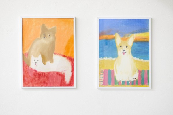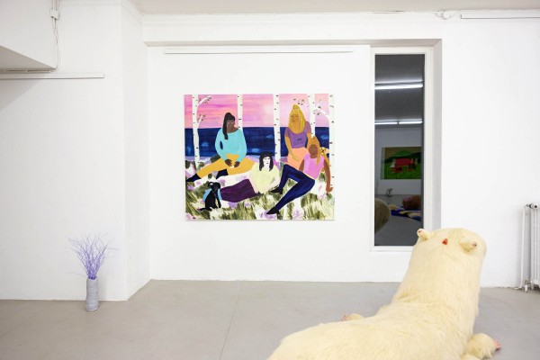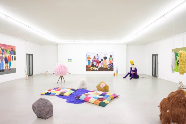 Auch in den Malereien und Keramiken von Josefine Schulz geht es um gemischte Gefühle. Auf ihren Gruppenbildern sind neben niedlichen Hündchen Teens und frühe Twens zu sehen, die auf den ersten Blick wirken, als seien sie lose nebeneinander platziert worden. Schaut man genauer hin, sieht man, wie sich ihre Protagonist:innen berühren, wie sie sich Blicke zuwerfen oder sie einander verweigern. Sie beschreibt damit eine Zeit im Leben, in der sehr viel Schicksalhaftigkeit im Zufall stecken kann, in der Sehnsüchte oft mit Furcht gepaart sind – etwa davor, dass Beziehungen zerbrechen statt zu überdauern. So modisch und selbstbewusst uns die Figuren von Schulz’ Bildern auch gegenübertreten mögen: ihre Posen sind ungelenk. Das offenbart ihre Unsicherheit auf liebevolle Weise. Hinter der distanziert-coolen Oberfläche – malerisch wie inhaltlich – verbirgt sich ein tiefliegendes Emotionsgeflecht aus Wünschen und Sorgen, Genuss und Beklemmung. Ein Sinnbild für die Zerbrechlichkeit von Freund:innenschaft.