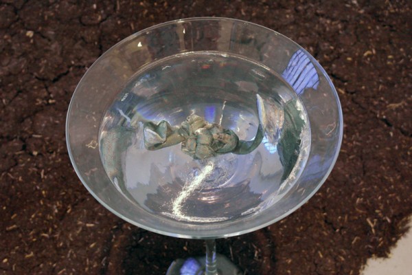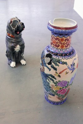Nina Beier (1975), die im Hamburger Kunstverein 23.5.—26.7.2015 ausstellt, ist nicht naiv. Der Raum ist treffsicher mit Arbeiten bestückt und überzeugt vom ersten Moment an. Porzellan-Hunde und Keramik-Vasen stehen sich gegenüber und sind durch komische Löcher miteinander in Verbindung gebracht – als ob ätzende Säure darauf getropft und durchgebrannt wäre. Vitrinen, die man von Wartebereichen der Kleinindustrie kennt – dort bestückt mit Prunkstücken der Produktion – zeigen hier merkwürdige Teile von Bronzeskulpturen. Überdimensionierte Weingläser, die normalerweise als Deko auf Partytischen mit Korken, Blumen oder treibenden Kerzen gefüllt sind, beinhalten jetzt in Kunstharz gegossene Hermès Krawatten, zerfummelte Geldscheine, tote Fische, Rasierklingen mit Wurst, farbige Pillen, von Scheren zerschnittene Kreditkarten und ein Ochsenhorn das Münzen ausschüttet. Alles steht im Zeichen des Füllhorns. Aber das Harz zieht Schlieren, zeigt Risse.
