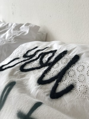 die weißen Kissen – mit schwarzem Graffiti,