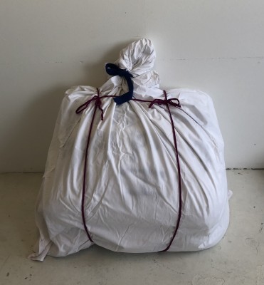 in Stoff eingewickelt und fest verschnürt.