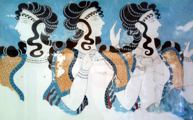 Die mythologische Entwicklungslinie der Großen Göttin wurde schließlich durch den indoeuropäischen Einfluß aus Zentralasien langsam aber erbarmungslos zurück gedrängt (8). Im mykenischen Griechenland konnte die Frau ihre gesellschaftliche Rolle noch eine zeitlang mit Rückgriff auf die minoische Kultur und Tracht bewahren, doch die politische und ökonomische Macht ging mehr und mehr in die Hände der Männer über (9), während die Frauen Hüter der heiligen Riten blieben; ein Prozess, der sich Jahrhunderte später wahrscheinlich bei den römischen Vestalinnen wiederholte.