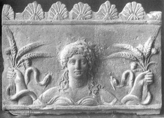 Sie ist die hellenistische Demeter und die römische Ceres, die nicht nur mit Getreideähren sondern ebenfalls häufig mit Schlangen abgebildet wurden.