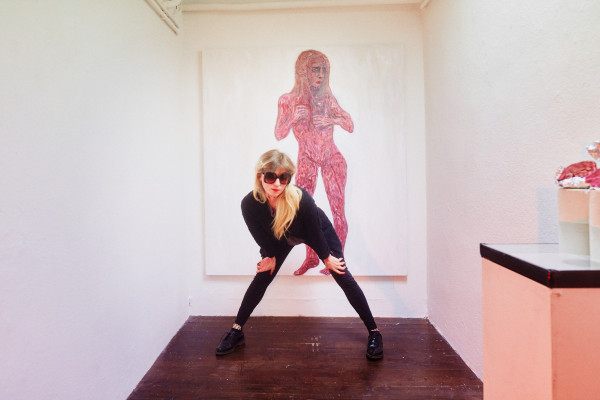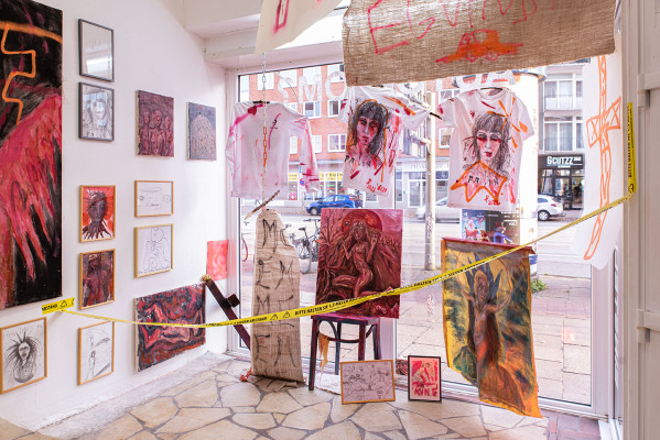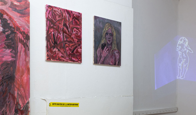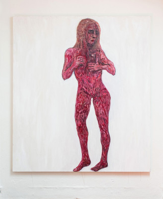 Eine großformatige Arbeit zeigt eine nackte, bzw. gehäutete Frau, die sich ein Handy vor die Brust hält - fast scheint es mit ihrem Körper verwachsen und an die Stelle ihres Herzens getreten zu sein. Es bleibt offen, ob sie sich selbst, oder den Betrachter damit fotografiert.
