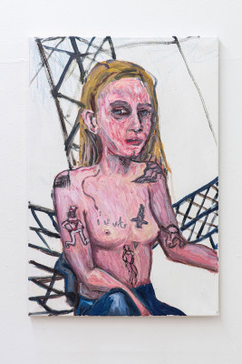 Zwei andere Aspekte zeigen sich auf einem Selbstportrait der Künstlerin, das angelehnt ist an ein Portrait des Journalisten Egon Erwin Kisch von Christian Schad aus dem Jahr 1928. Auf Schads Bild sieht man Kisch mit nacktem Oberkörper posieren; deutlich dabei zu sehen sind dessen Tatoos, die sich einer eindeutig rassistischen und sexistischen Bildsprache bedienen. Wir finden auf diesem Bild die stolze Selbstentblößung des Mannes, sowie seinen hierarchischen, bildgebenden Blick auf die beherrschten Gesellschaftsgruppen, in diesem Fall Frauen in pornographisierten Posen, Afro-Amerikaner als Witzfiguren und Asiaten als Mordopfer.