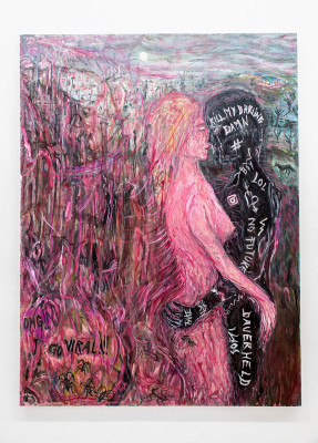 Denn während man als Betrachter*in der weiblichen Figur eine Nacktheit zugesteht, die nicht vom männlichen Blick befohlen, sondern selbst frei gewählt ist, migriert von der männlichen Figur lediglich das Wort „Slut“, also „Schlampe“ aus seinem anonymen Inneren auf ihren Körper über, und unternimmt damit den Versuch, sie dem patriarchalen Herrschaftsmuster „Heilige oder Hure“ und dem pornographisierenden Blick zu unterwerfen.