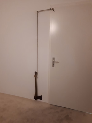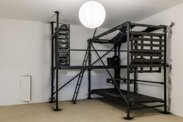 Ein angenehmer Kontrapunkt findet sich im Keller. Dort steht, inmitten von Weihnachtsbäumen, ein schwarzes Ledersofa. Ich atme eine Brise Wald ein und streife gedankenverloren entlang eines Tannenastes, froh über die Möglichkeit etwas in die Hand zu nehmen. Für einen Moment bin ich ganz woanders. Dann kehrt meine Aufmerksamkeit zu den erstaunlich grünen Tannen zurück, und ich frage mich, warum sie weder fahl werden noch nadeln. Direkt darüber befindet sich ein Raum, den ich nicht entdeckt hätte, wenn nicht vor mir eine Aufsicht hinein geschaut hätte. Das Zimmer wird von einer schwarz angesprayten Holzinstallation dominiert, die an ein erweitertes Hochbett inklusive Laptop, Bücherregal und Sitzgelegenheiten erinnert. Eine biografische Lesart drängt sich auf, wahrscheinlich ist die Künstlerin in einem ebensolchen Möbel groß geworden (und hat sich damals schon die Balken entlang gehangelt?). Neben der Tür hängt eine Axt, die mit ihrem Gewicht das Öffnen der erschwert. In meiner Phantasie spiele ich diverse Szenarios durch, was man mit dieser Axt alles anfangen könnte und wundere mich, dass noch niemand auf die Idee gekommen ist, mit ihr auf die Installation einzudreschen.